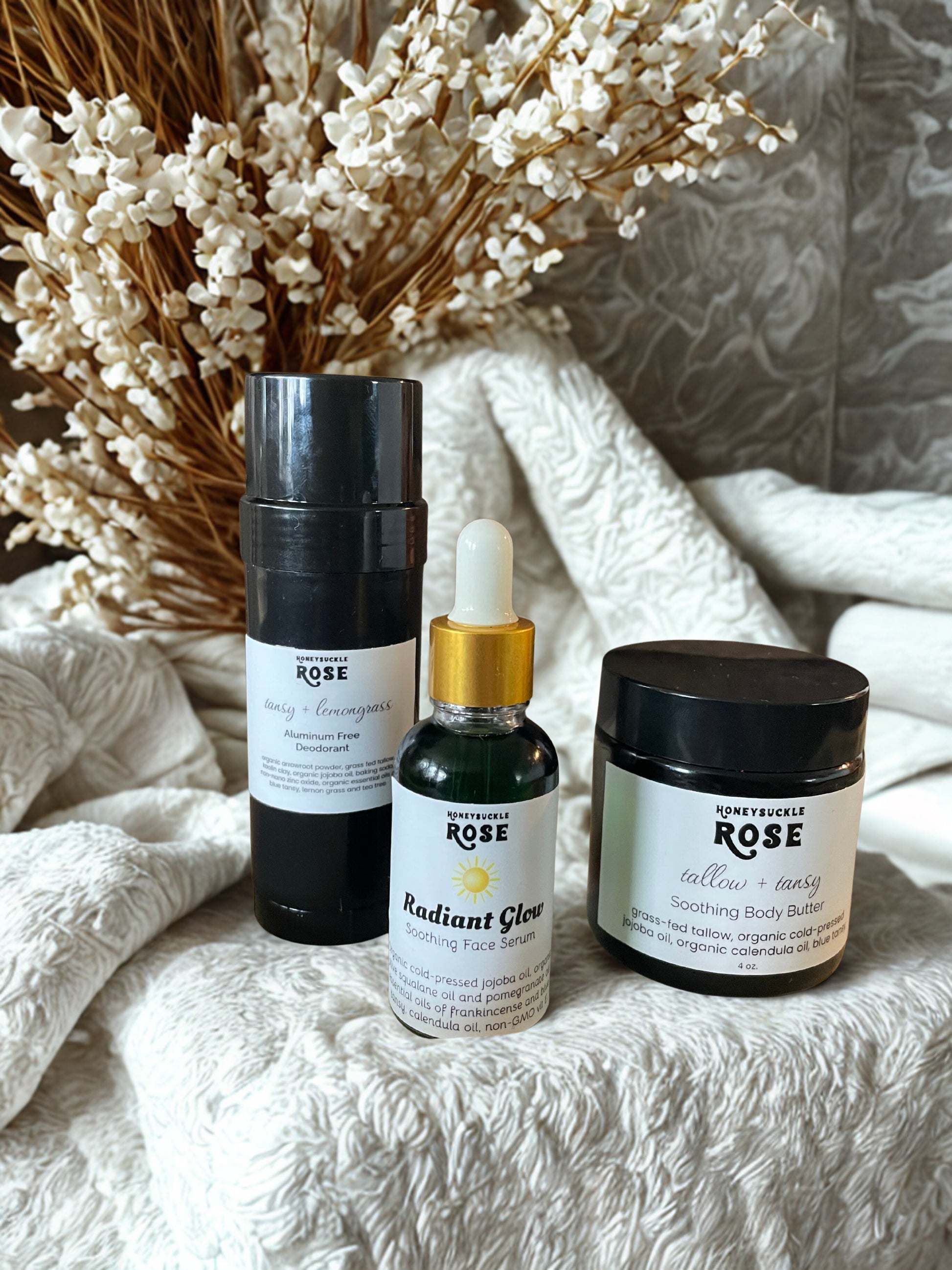 Our Blue Tansy Collection is crafted to soothe, balance, and restore even the most sensitive skin. Featuring our Aluminum Free tansy+tallow deodorant, Radiant Glow Serum, and tallow+tansy soothing body butter. Each product is made with clean, intentional ingredients your skin will love. Gentle, Nourishing and made in small batches
